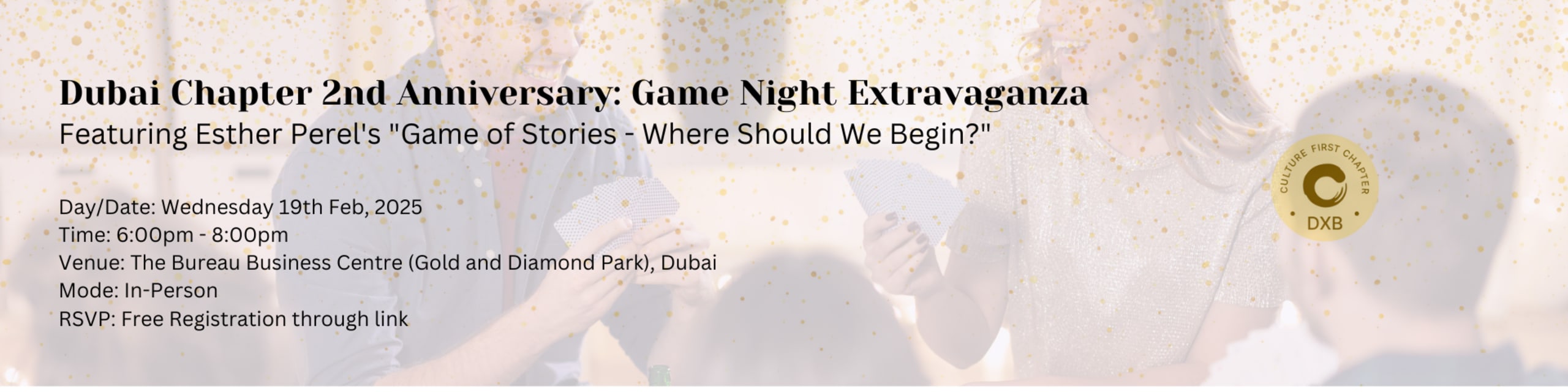Join us for an unforgettable evening as we celebrate the 2nd anniversary of the Dubai Chapter with an engaging Game Night featuring Esther Perel's "Game of Stories - Where Should We Begin?"